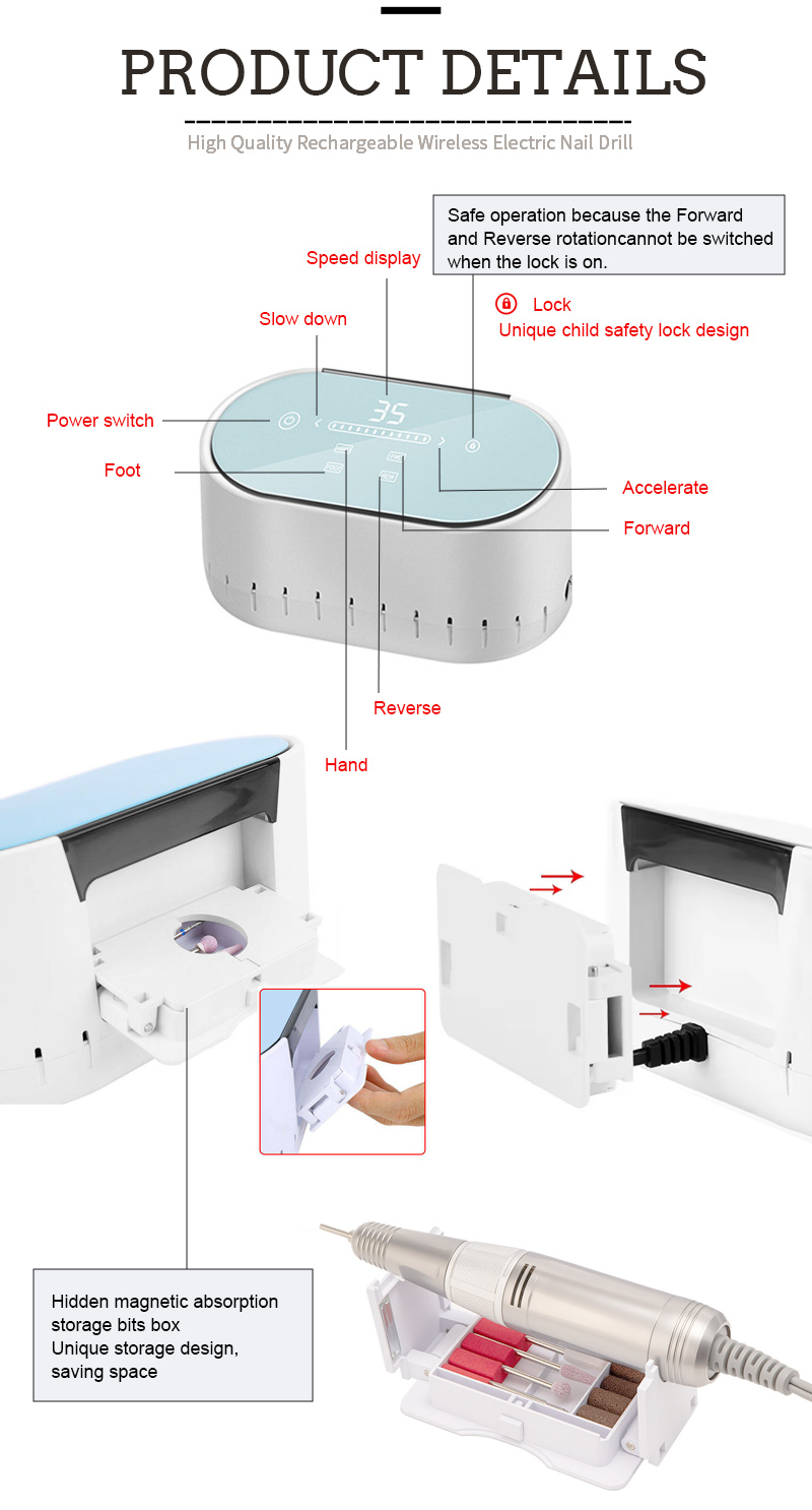 217 მაღალსიჩქარიანი 35000 rpm ელექტრო ფრჩხილის ფაილის პროდუქტის მახასიათებლები და პროგრამები პოლონური მოსაშორებლად