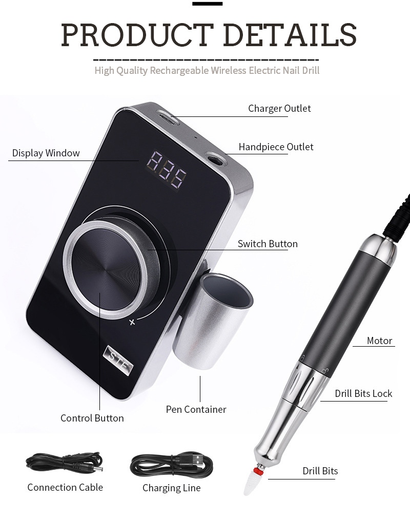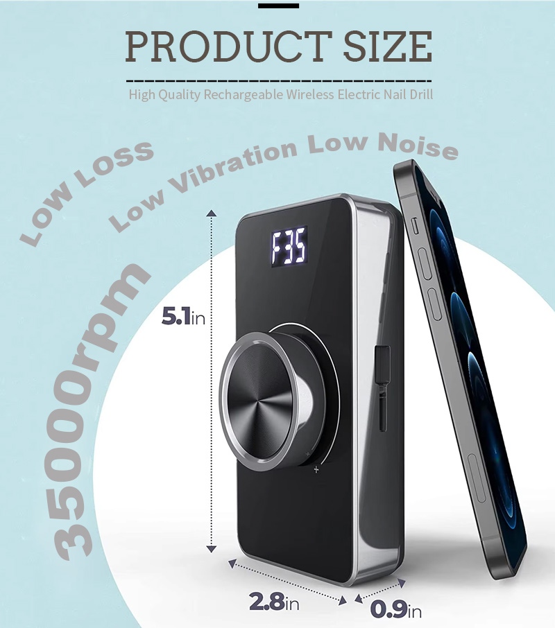 ამ ამქერცლავი 35000 ბრ/წთ ელექტრო ფრჩხილის საბურღი დისპლეის დიზაინს აქვს ჩართვა/გამორთვის გადამრთველი და წინ/უკუ როტაცია მთლიანი ერთი ღილაკით გააქტიურებისთვის, სწრაფი დამუხტვის სოკეტი ქვედა ნაწილში, შესაცვლელი საბურღი სოკეტი ზედა და სამი პოზიციის რეგულირებადი სიჩქარე სხვადასხვა საჭიროებების დასაკმაყოფილებლად.