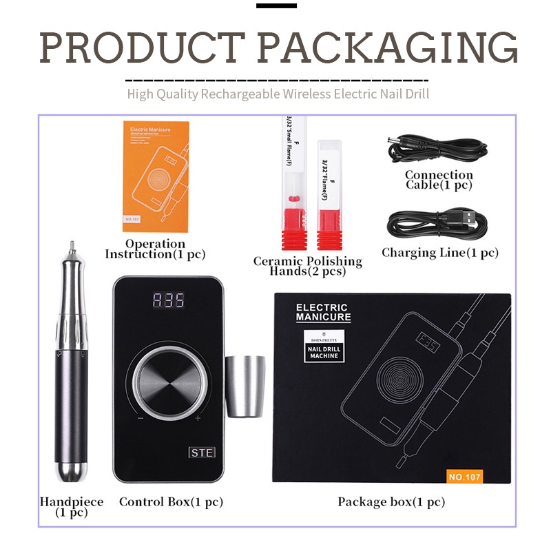 ამ ამქერცლავი 35,000 ბრ/წთ ელექტრო ფრჩხილის საბურღი პაკეტის შიგთავსს აქვს სახამებელი კალმის პროდუქტი, USB დამტენი კაბელი, პროდუქტის ინსტრუქციის სახელმძღვანელო და მსუბუქი და პორტატული ყუთი.