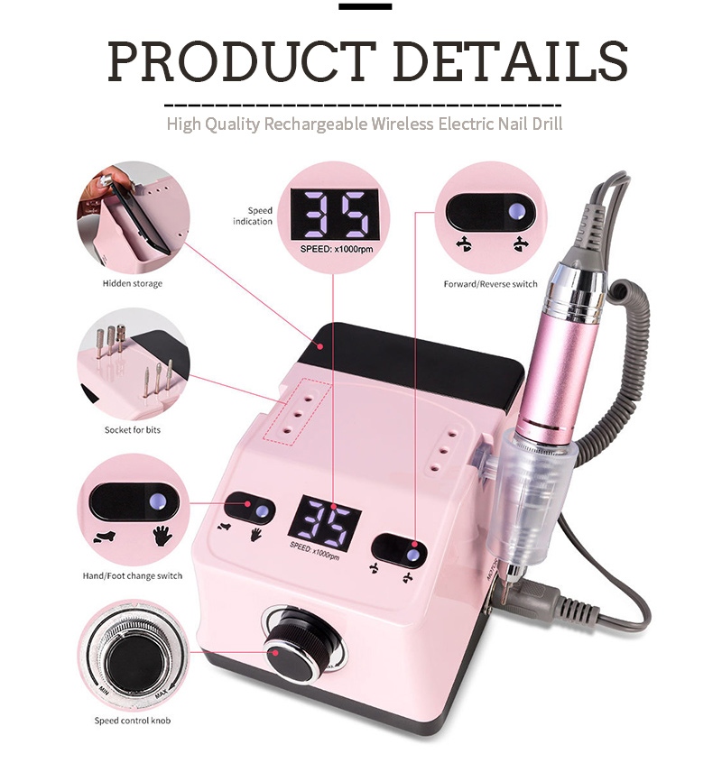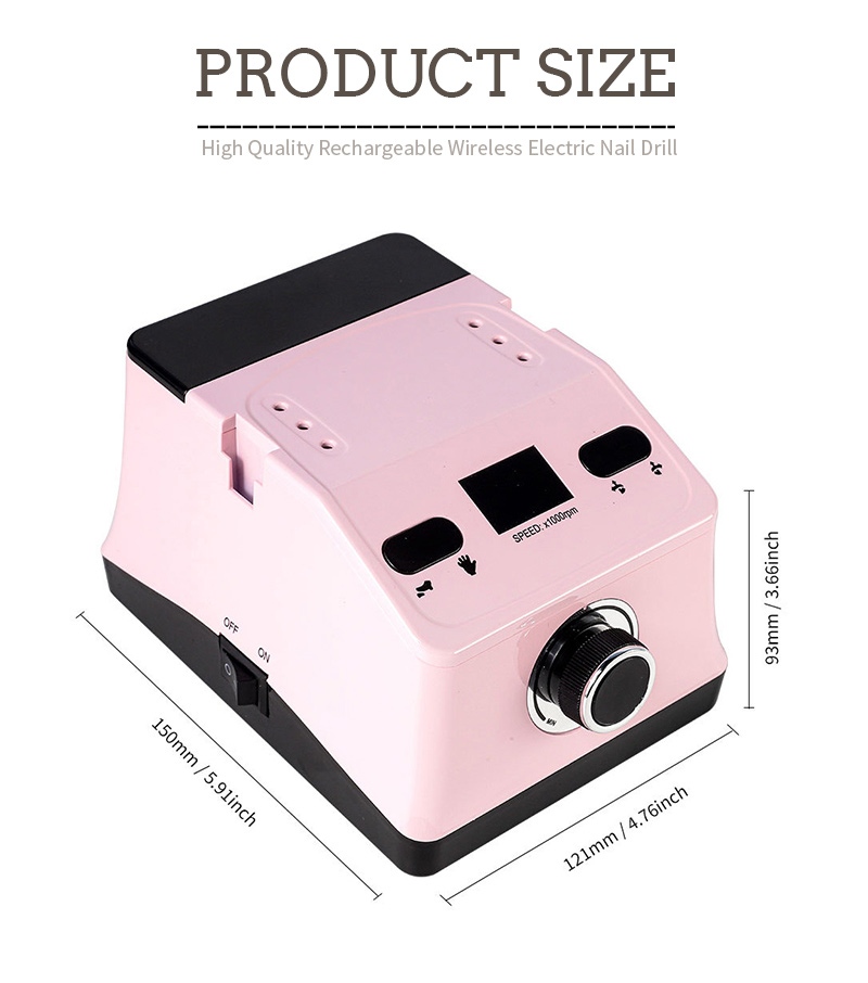 ამ ხელის ფრჩხილის საბურღი და გასაპრიალებელი დისპლეის დიზაინს აქვს ჩართვის/გამორთვის გადამრთველი და წინ/უკუ როტაცია სულ ერთი ღილაკით გააქტიურებისთვის, სწრაფი დამუხტვის სოკეტი ქვედა ნაწილში, შესაცვლელი საბურღი სოკეტი ზევით და სამი პოზიციის რეგულირებადი სიჩქარე სხვადასხვა საჭიროებების დასაკმაყოფილებლად.