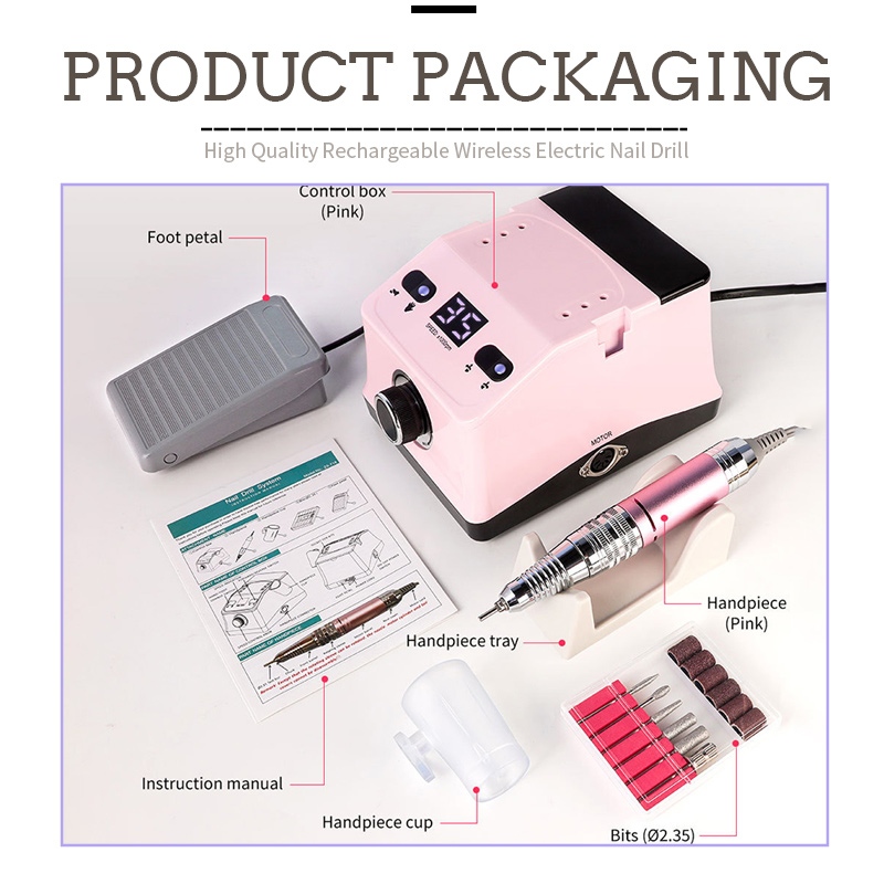 ამ ხელის ფრჩხილის ბურღისა და გასაპრიალებელი პაკეტის შიგთავსს აქვს სახამებელი კალმის პროდუქტი, USB დამტენი კაბელი, პროდუქტის ინსტრუქციის სახელმძღვანელო და მსუბუქი და პორტატული ყუთი.