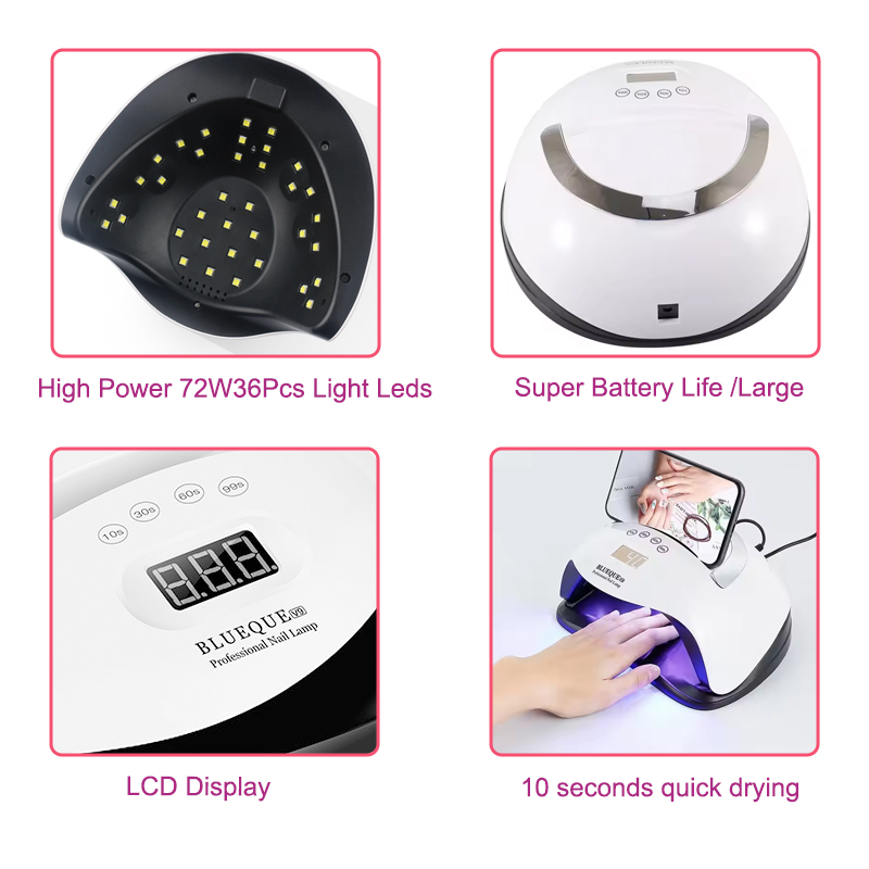 მაღალი ხარისხის ფრჩხილის ნათურა ტაიმერის ფუნქციით უზრუნველყოფს წებოს თანაბრად გაშრობას შეკუმშვის გარეშე. მისი ორმაგი სინათლის წყაროები უზრუნველყოფს რბილ გათბობას ხელის გაუფერულებისა და თვალის დაძაბვის თავიდან ასაცილებლად, შესაფერისია როგორც ხელებისთვის, ასევე ფეხებისთვის, რაც იძლევა საოცრად სწრაფად გაშრობის შედეგებს.
