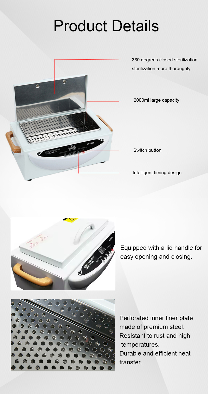ეს სტერილიზატორი ძირითადად წარმოქმნის სითბოს გამათბობელი რგოლის მეშვეობით, დეზინფექციისთვის მაღალ ტემპერატურას იყენებს.