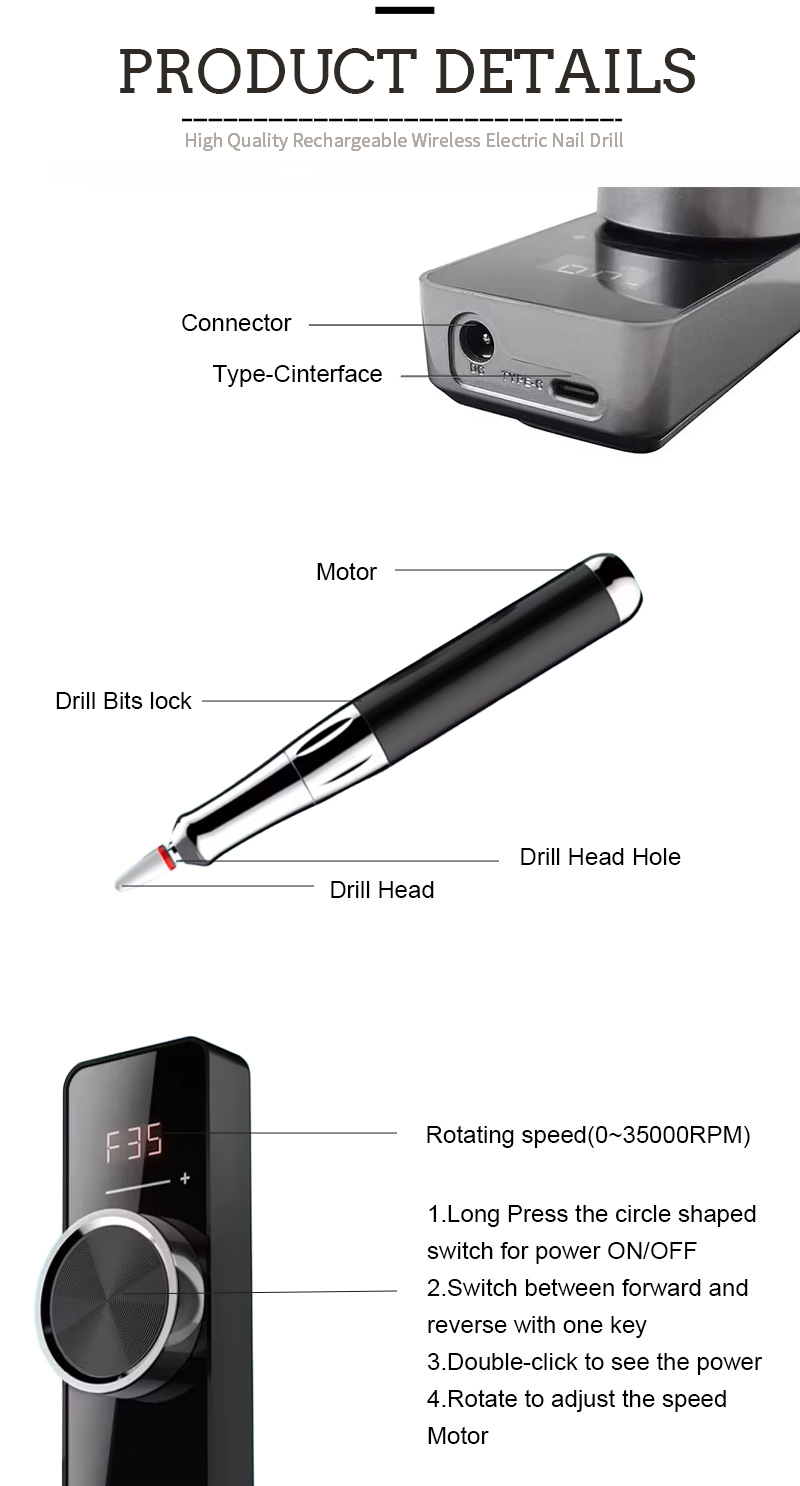 პორტატული ფრჩხილის საბურღი კომპლექტი ელექტრო ძლიერი ძრავით 65w 35000 rpm