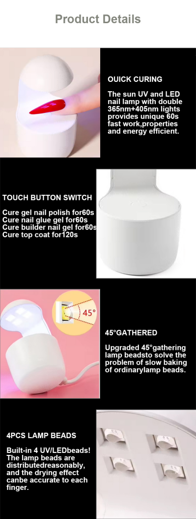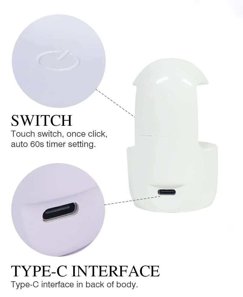 მინი ერთი თითის ფრჩხილის ნათურა უზრუნველყოფს წებოს თანაბარ გაშრობას შეკუმშვის გარეშე. მისი ორმაგი სინათლის წყაროები უზრუნველყოფს რბილ გათბობას ხელის გაუფერულებისა და თვალის დაძაბვის თავიდან ასაცილებლად, შესაფერისია როგორც ხელებისთვის, ასევე ფეხებისთვის, რაც იძლევა საოცრად სწრაფად გაშრობის შედეგებს.
