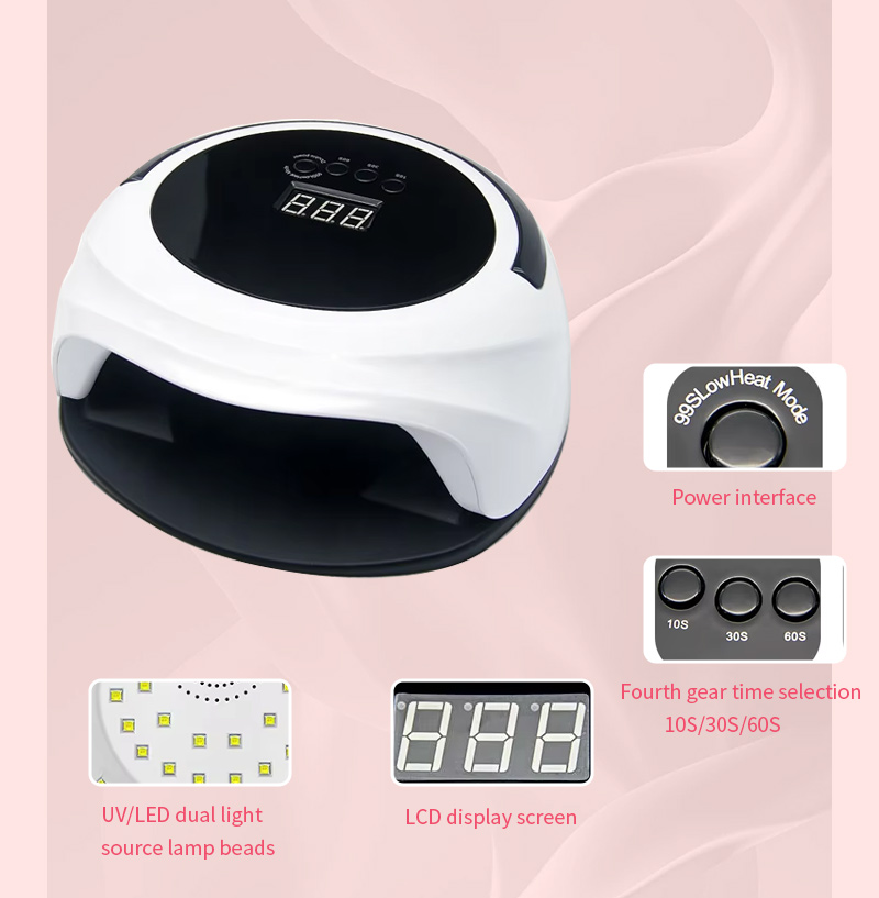 ფრჩხილის საშრობი ნათურა ავტომატური სენსორის ფუნქციით უზრუნველყოფს წებოს გაშრობას შეკუმშვის გარეშე. მისი ორმაგი სინათლის წყაროები უზრუნველყოფს რბილ გათბობას ხელის გაუფერულებისა და თვალის დაძაბვის თავიდან ასაცილებლად, შესაფერისია როგორც ხელებისთვის, ასევე ფეხებისთვის, რაც იძლევა საოცრად სწრაფად გაშრობის შედეგებს.