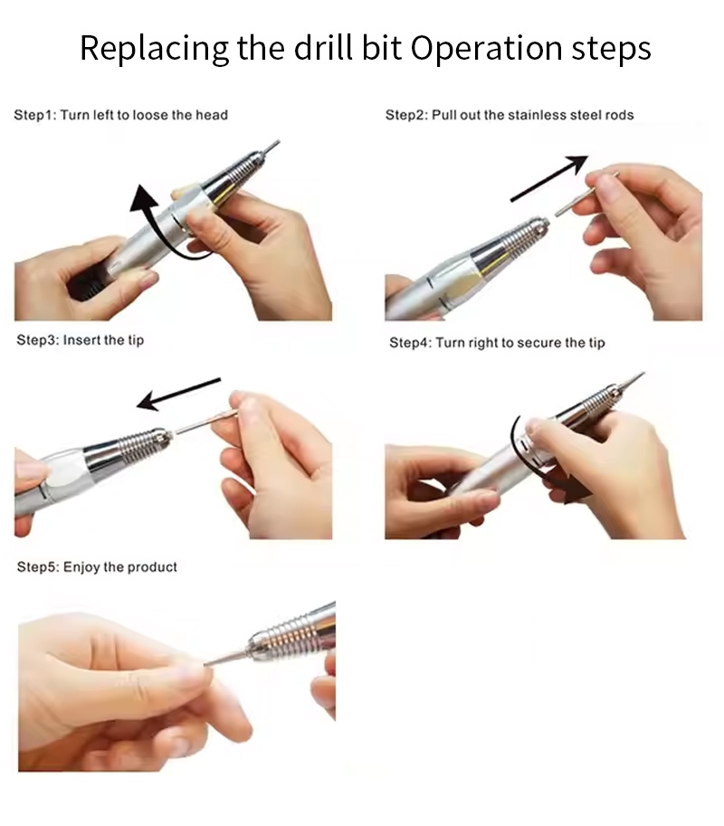 ეს პროფესიონალური პორტატული ფრჩხილის საბურღი მანქანა 35000 ბრ/წთ ჩანაცვლების საბურღი მუშაობის მეთოდია, ანუ ჩასმა და ამოღება, მარტივი და მოსახერხებელი, ჩანაცვლება შეიძლება გამოყენებულ იქნას დასრულების შემდეგ.