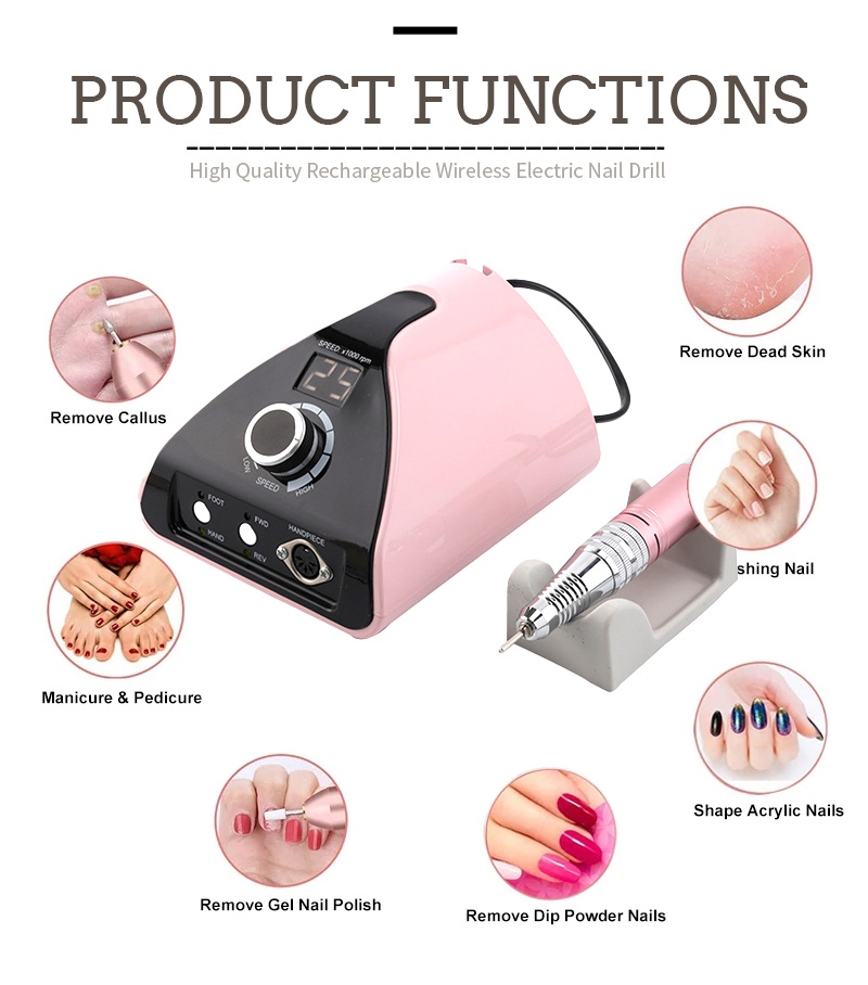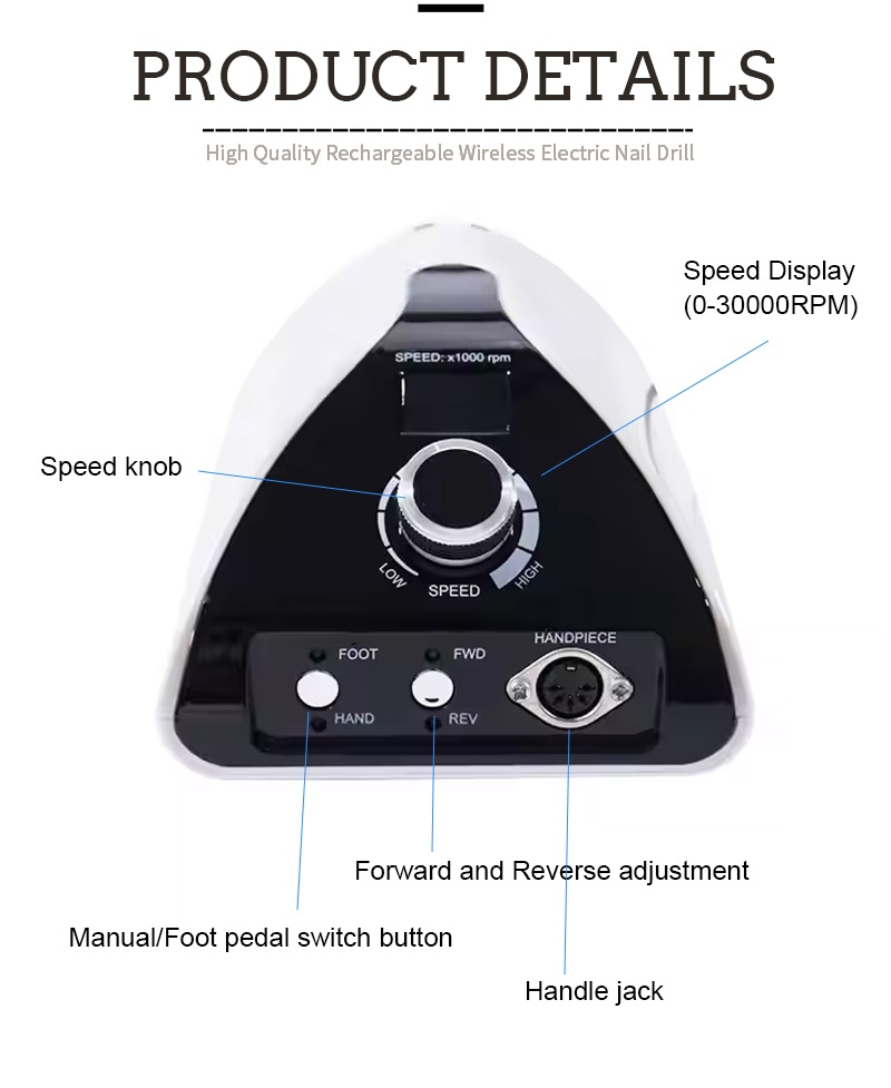 ეს პროფესიონალური პორტატული ფრჩხილის საბურღი მანქანა 35,000 rpm აქვს 2 ფერის არჩევანი, შავი/თეთრი/ნაცრისფერი/ლურჯი/წითელი/ვარდისფერი/ნარინჯისფერი, ფერადი ფერები.