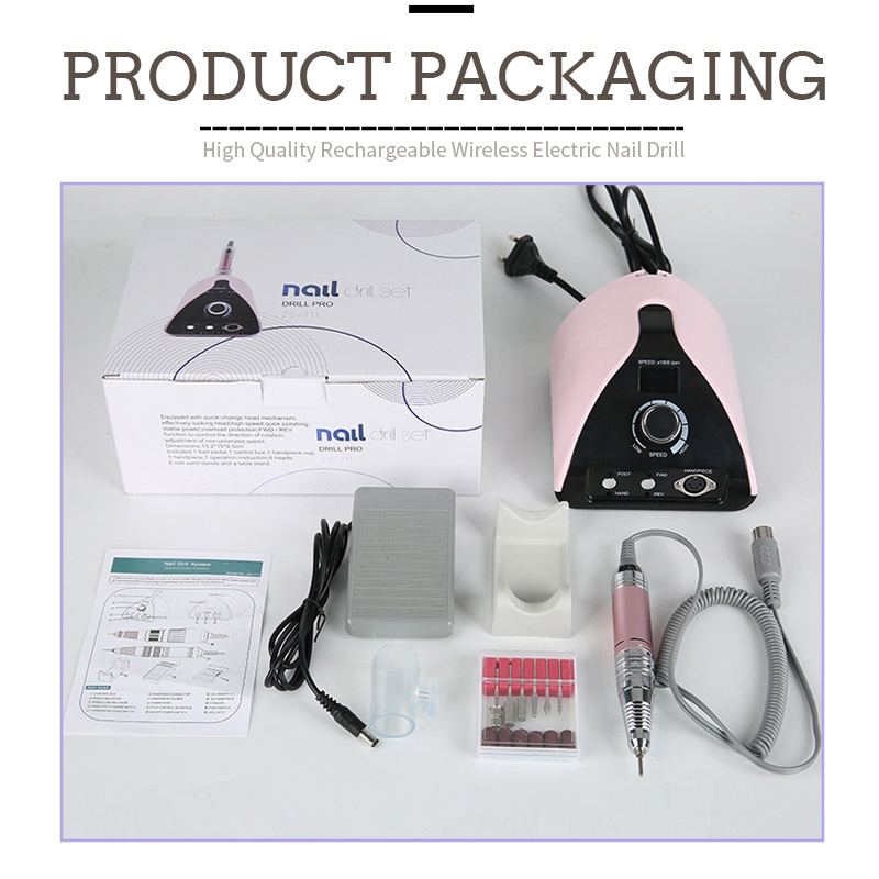ამ პროფესიონალური პორტატული ფრჩხილის საბურღი მანქანის 35,000 ბრ/წთ პაკეტის შიგთავსს აქვს მოსახვეწი კალმის პროდუქტი, USB დამტენი კაბელი, პროდუქტის ინსტრუქციის სახელმძღვანელო და მსუბუქი და პორტატული ყუთი.
