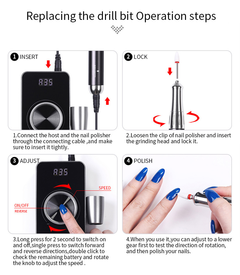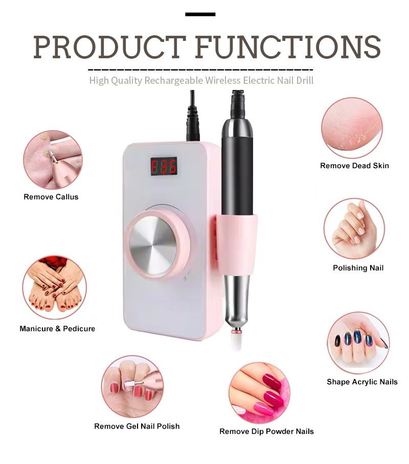 პროდუქტის ფუნქცია და 107 მაღალი სიჩქარის 35000 rpm ფრჩხილის პოლონური მოსაშორებელი ელექტრო ფრჩხილის ფაილის გამოყენება