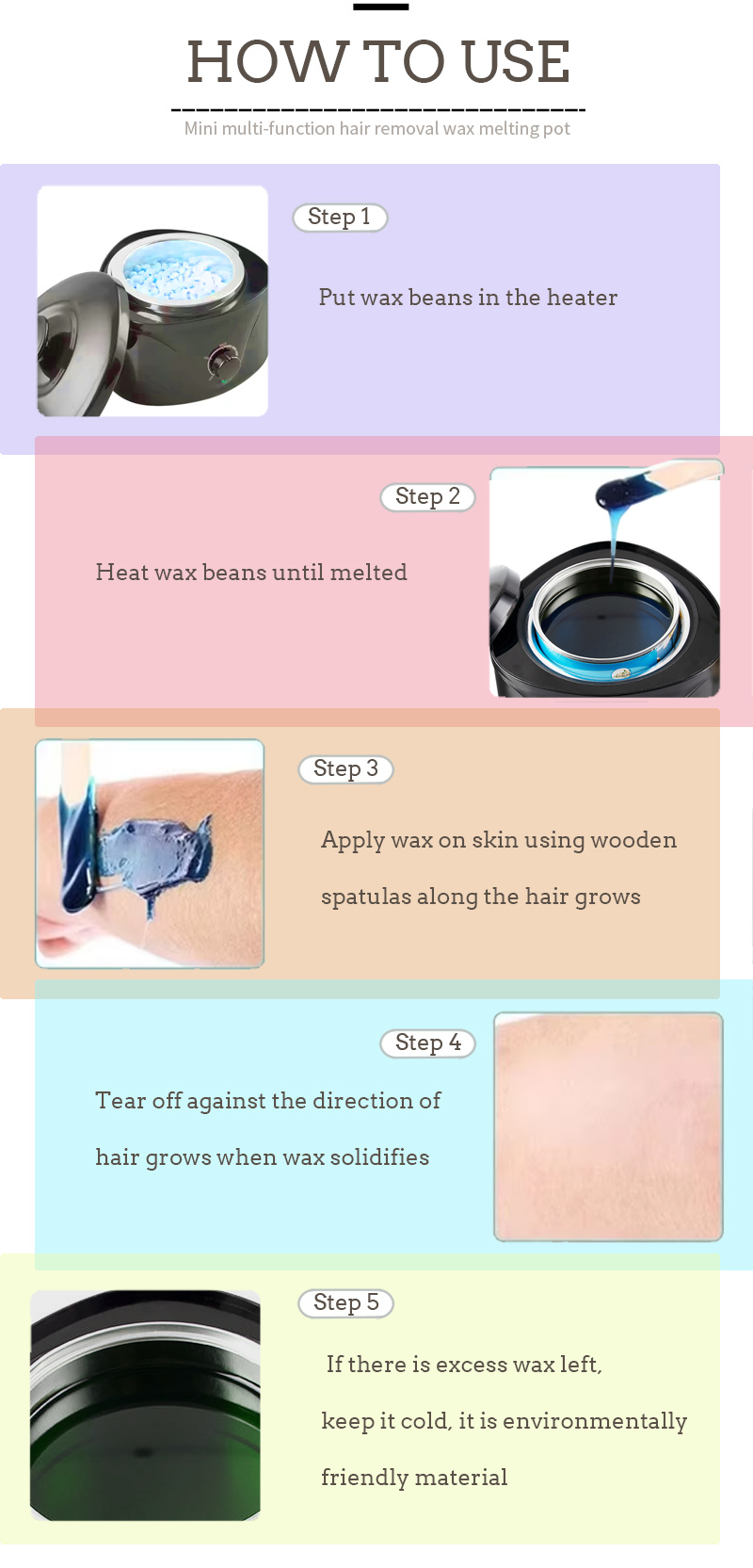 პროდუქტის დეპილაციური ცვილის ოპერაციის მეთოდი, რაც უფრო მაღალია ტემპერატურა, მით უფრო სწრაფად დნება ცვილი, რაც უფრო დაბალია ტემპერატურა, მით უფრო ნელა დნება ცვილი, ჯერ ჩაასხით შესაბამისი რაოდენობის დეპილაციური ცვილის ლობიოში, გააცხელეთ ცვილის მარცვლების დნობამდე, შემდეგ ერთნაირად დაფარული დეპილაციური ცვილის დეპილაციური ნაწილები და ბოლოს თმის ზრდის მიმართულებით იშლება.